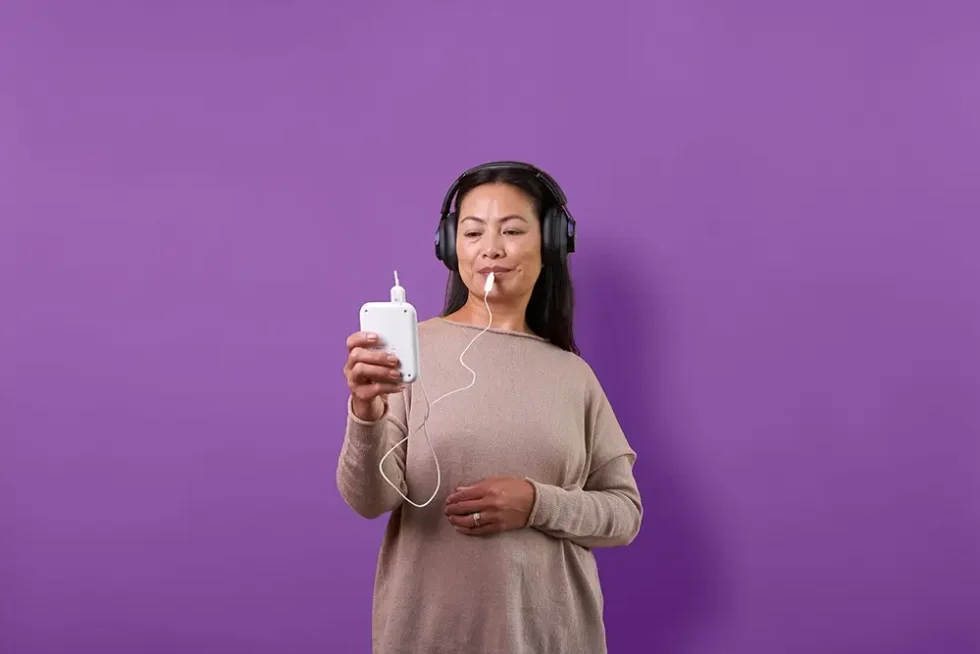 A patented device, the Tonguetip, fits comfortably in the mouth, delivering mild energy pulses to the tongue to activate the brain’s plasticity